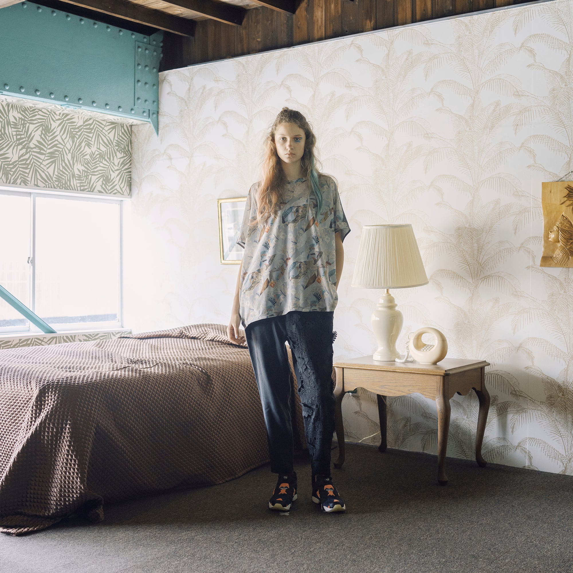 麻混の涼しげな素材と立体的に編まれたレース素材を組み合わせたシルエットの美しいイージーパンツ。